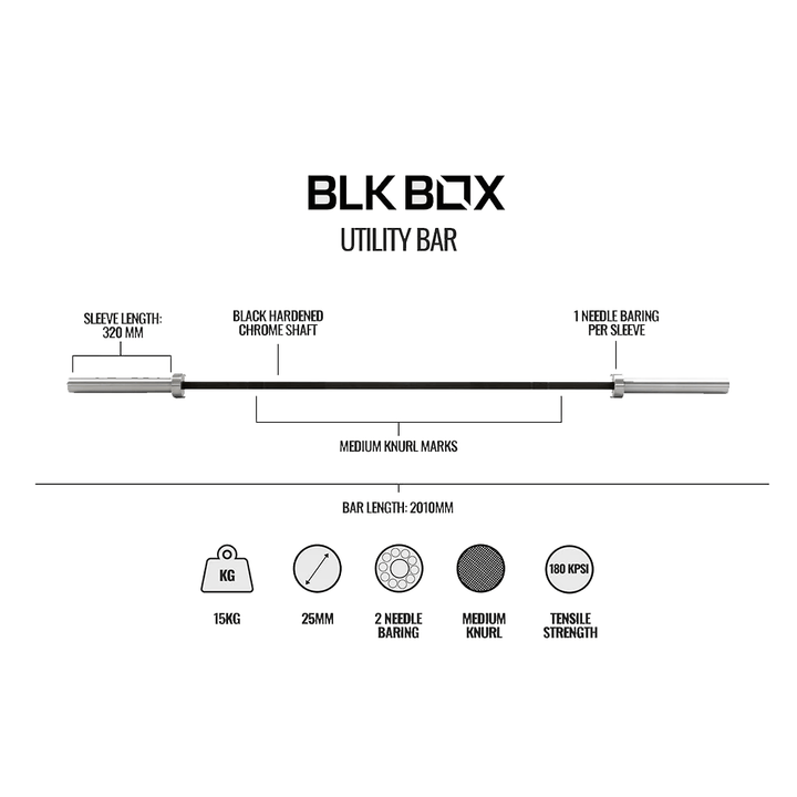 Perfect for beginners, home gyms, and functional training facilities, the BLK BOX Utility Bar offers a solid, dependable lifting experience for a wide range of movements.