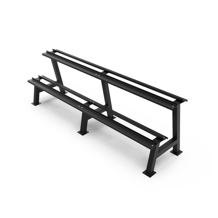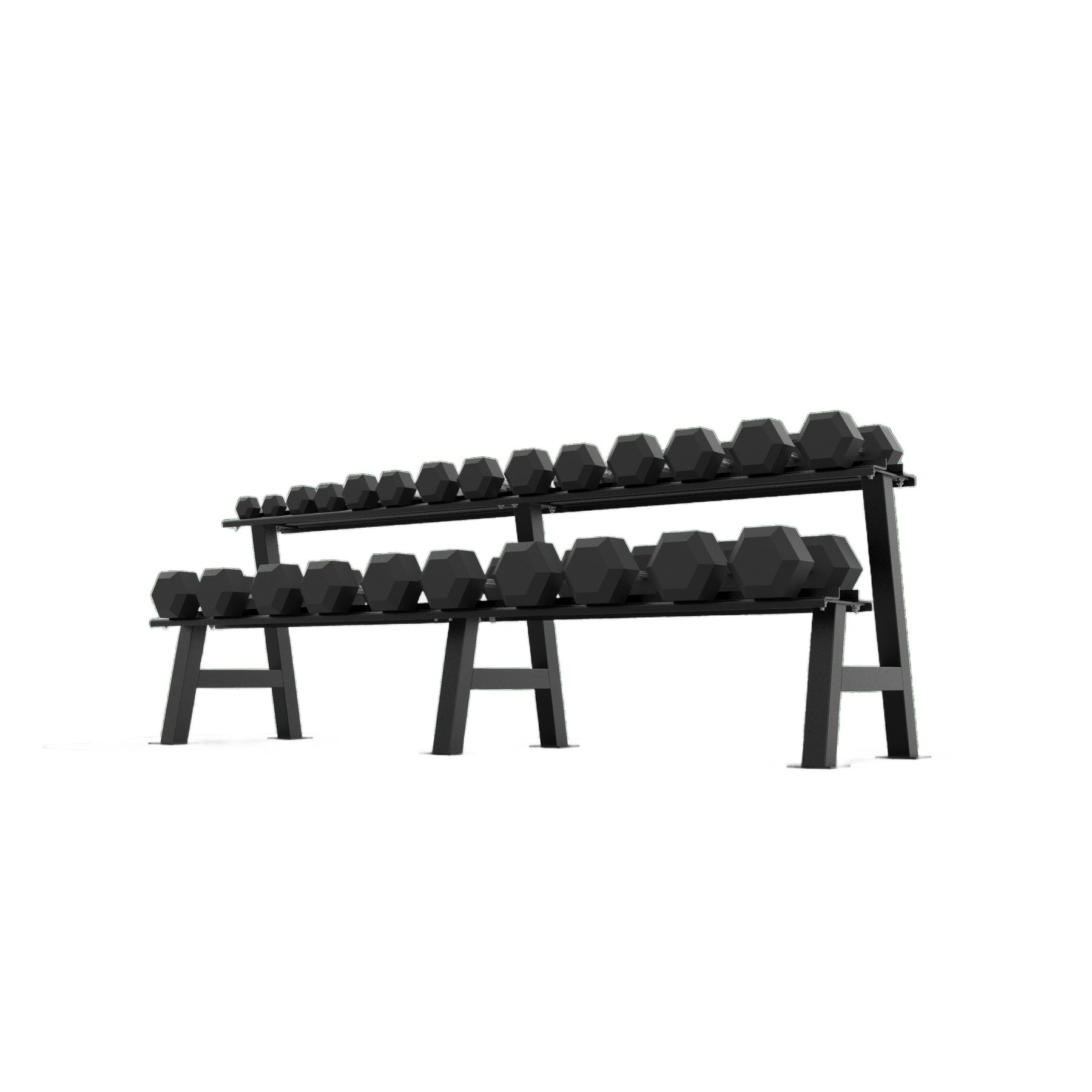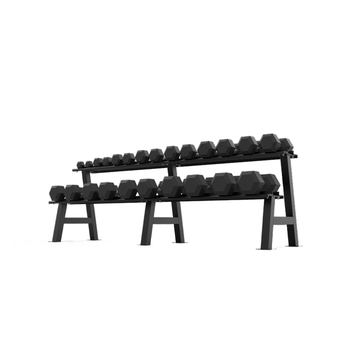 The 2 Tier Hex Dumbbell Rack stores up to 12 pairs of Hex Dumbbells safely and securely, providing a premium storage solution for any gym. Ergonomically angled shelves allow for easy access, reduce the risk of injury and prevent dumbbell damage.