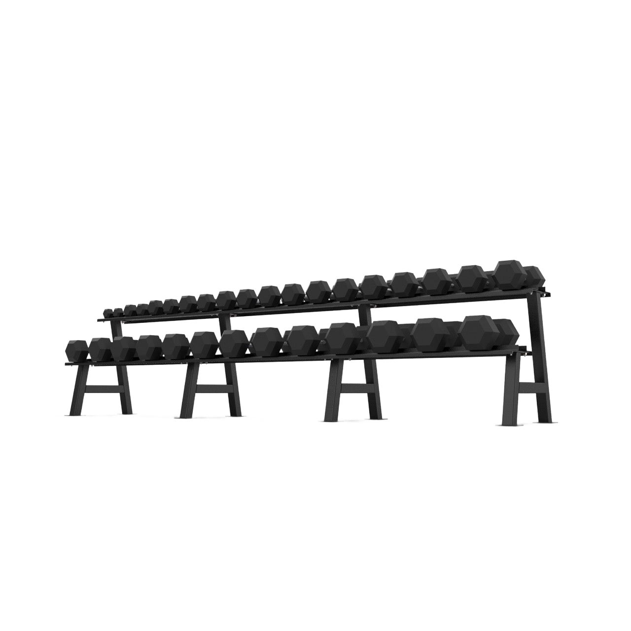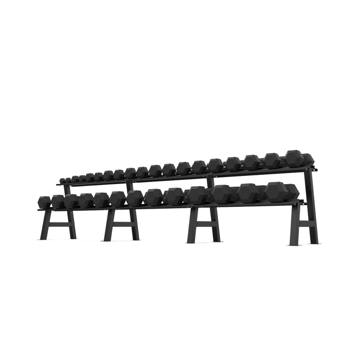 This 2 Tier Hex Dumbbell Rack stores up to 16 pairs of Hex Dumbbells safely and securely, providing a premium storage solution for any gym. Ergonomically angled shelves allow for easy access, reduce the risk of injury and prevent dumbbell damage.