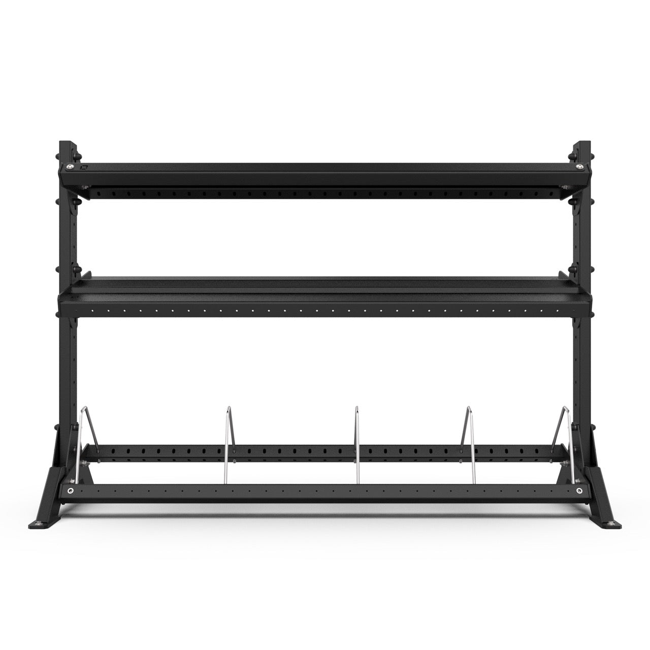 Shelves can be installed flat or at a 15-degree angle and fixed in one of three positions (front, middle, or back) to maximise convenience and space. The system can be configured to store everything from light dumbbells to heavy weight plates or even used to create a functional divide between training zones.