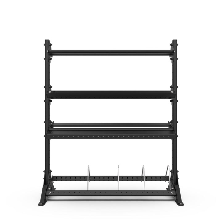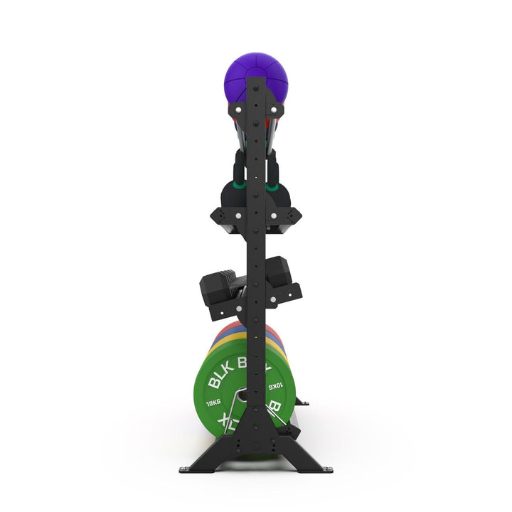 Each shelf is lined with durable rubber to protect equipment, reduce noise, and minimise wear. Flat shelves provide stable, easy access for kettlebells, medicine balls, and smaller items. Ball shelves feature a subtle curve to securely cradle medicine and slam balls, preventing roll-off. Dumbbell shelves keep weights organised, secure, and easy to access, with dedicated options available for round dumbbells and hex dumbbells. Bumper plate shelves provide durable, flat storage to hold plates of all sizes, ensuring a tidy and efficient lifting area.