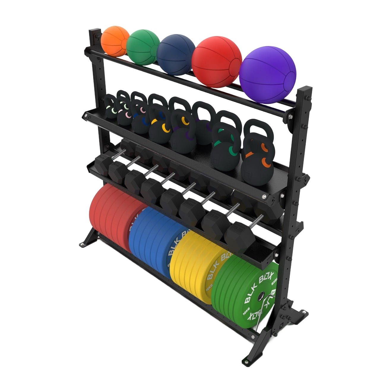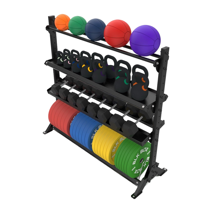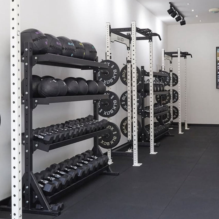 Each shelf is lined with durable rubber to protect equipment, reduce noise, and minimise wear. Flat shelves provide stable, easy access for kettlebells, medicine balls, and smaller items. Ball shelves feature a subtle curve to securely cradle medicine and slam balls, preventing roll-off. Dumbbell shelves keep weights organised, secure, and easy to access, with dedicated options available for round dumbbells and hex dumbbells. Bumper plate shelves provide durable, flat storage to hold plates of all sizes, ensuring a tidy and efficient lifting area.
