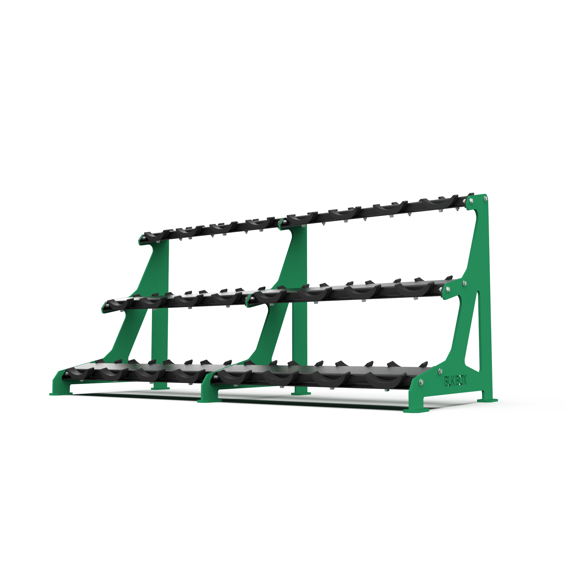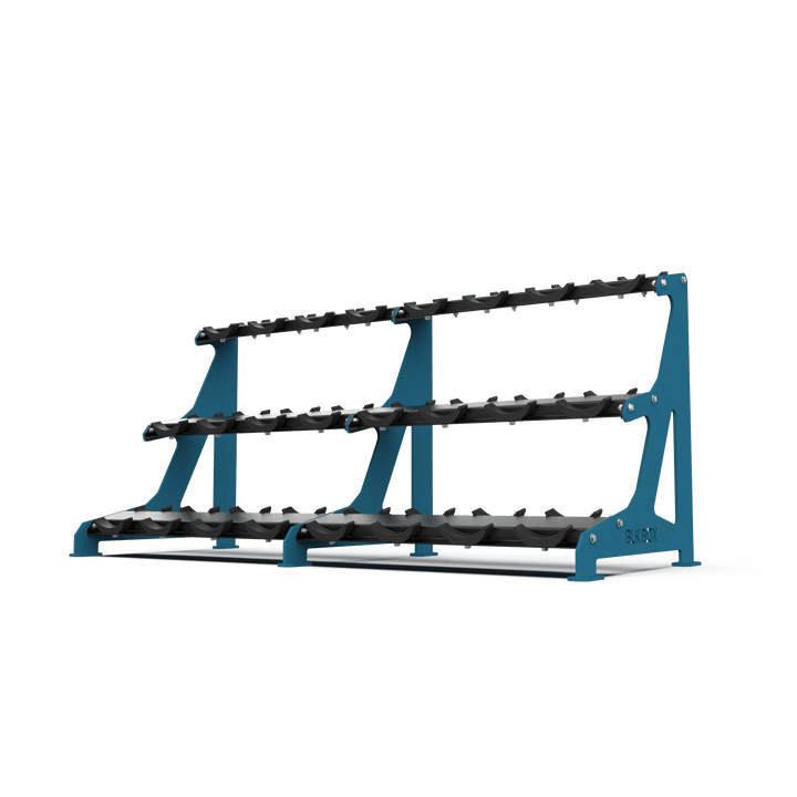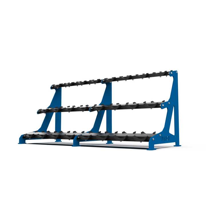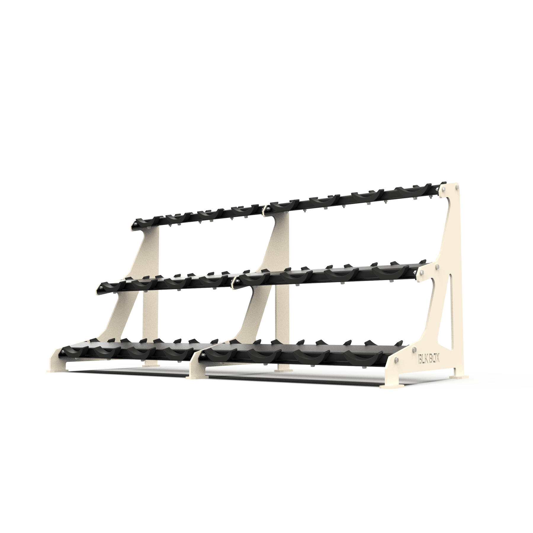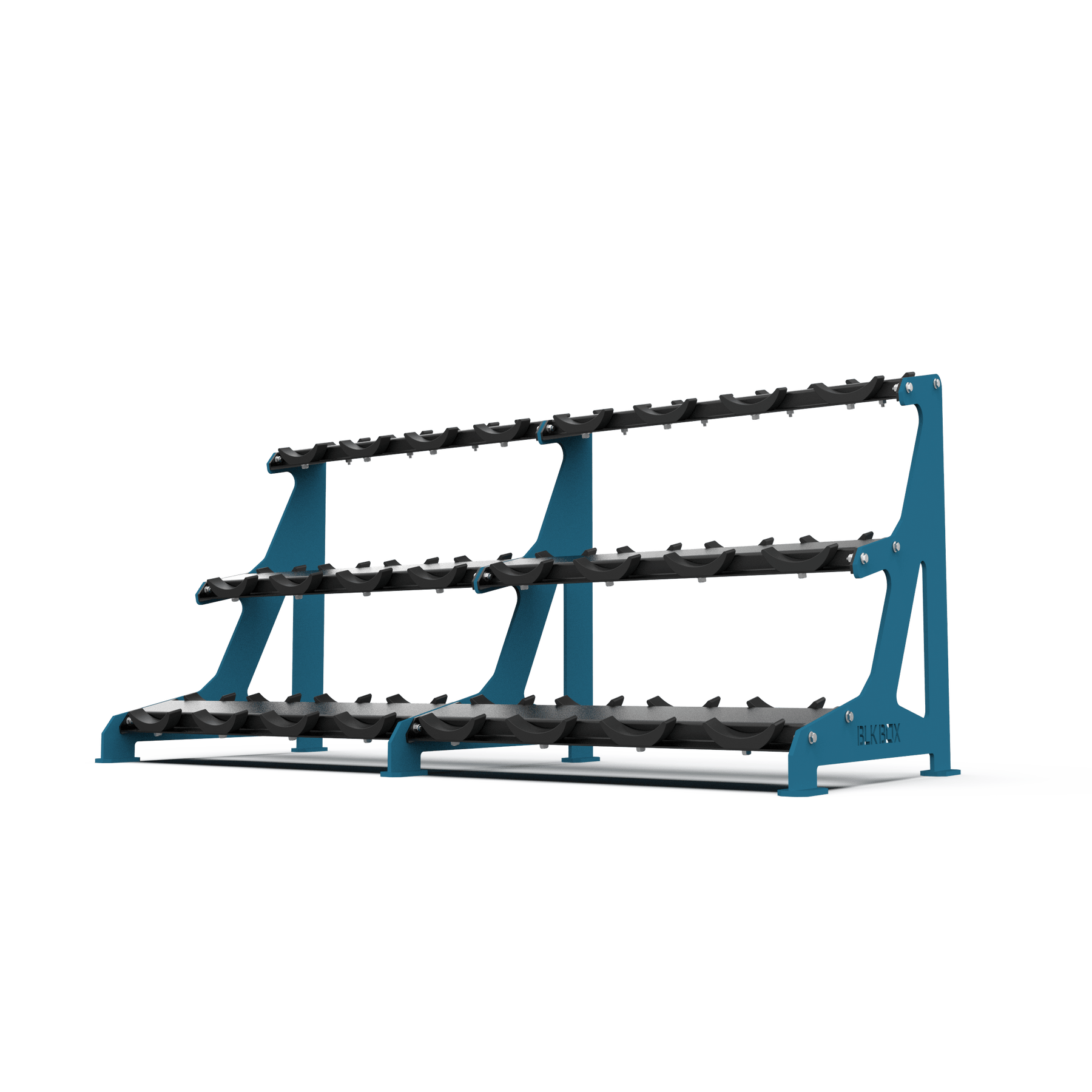 Designed for use with BLK BOX Urethane Dumbbells, it offers a range of colour options to suit any gym aesthetic. Sloped shelves ensure safe, ergonomic access when lifting or re-racking, while rubber-coated saddles and a central rail divider keep dumbbells securely in place. The result is a stable, safe, and efficient storage solution for gyms that demand performance.