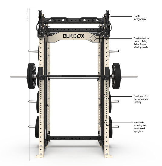 This configuration delivers one Full Rack and one Compact Rack, with integrated cable columns on the compact side. Designed for performance and flexibility, it includes twin pull-up bars, dual squat bays, and one 120kg stack – perfect for multi-discipline training areas.