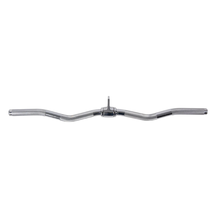 A solid steel bar with a chrome finish, ergonomically curved for tricep pushdowns, bicep curls, and reverse curls, reducing wrist strain while supporting close and medium grip movements.