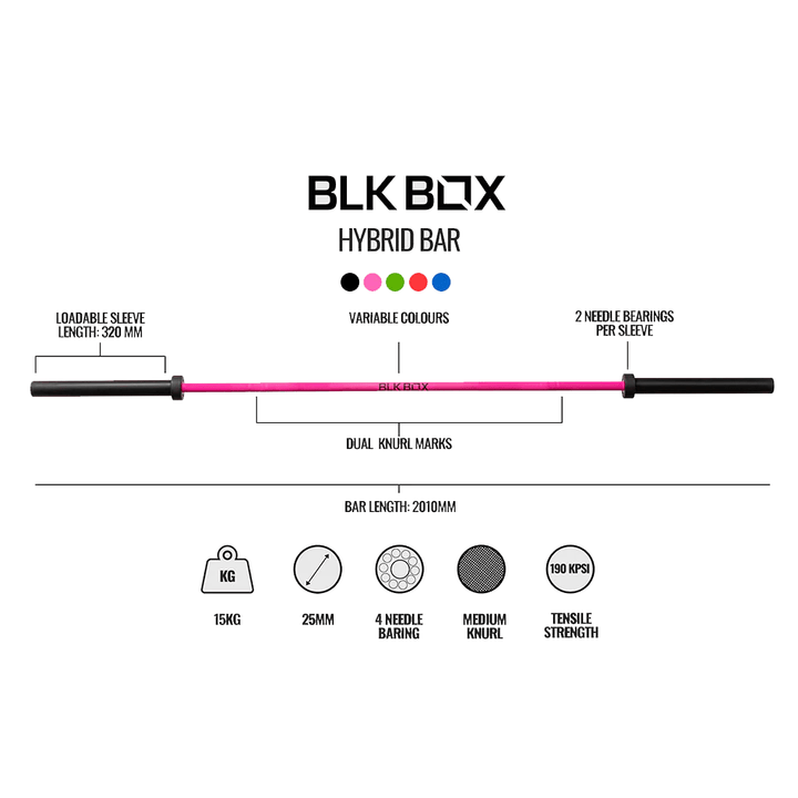 The BLK BOX Hybrid Bar 15kg is designed to deliver high performance for hybrid, functional, and CrossFit training, all in a style that suits your gym. Available in five vibrant colours, this bar combines versatility with quality, making it the perfect choice for a wide range of training environments.