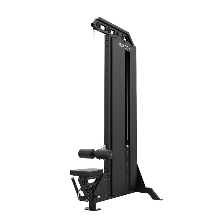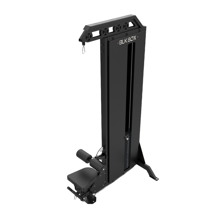 Targeting the lats, traps, rhomboids and biceps, the BLK BOX Lat Pulldown & Low Row is a heavy-duty, space-saving addition to any gym environment.