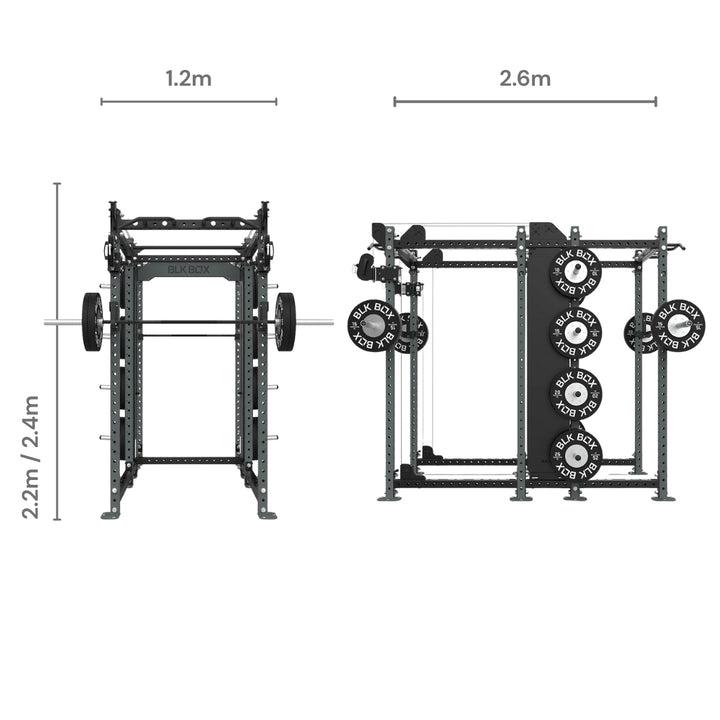 This configuration delivers one Full Rack and one Compact Rack, with integrated cable columns on the compact side. Designed for performance and flexibility, it includes twin pull-up bars, dual squat bays, and one 120kg stack – perfect for multi-discipline training areas.