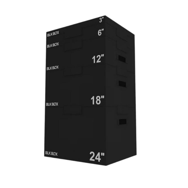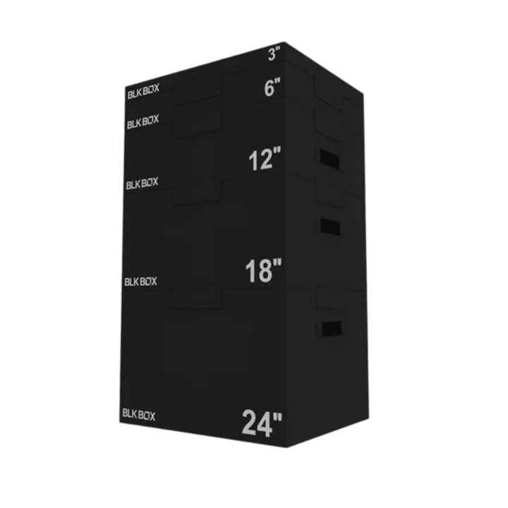 Durable foam plyo boxes with hard-wearing vinyl cover, offering a stable landing surface. Use individually or stack for adjustable training heights. Set includes 3ā, 6ā, 12ā, 18ā, and 24ā boxes.
