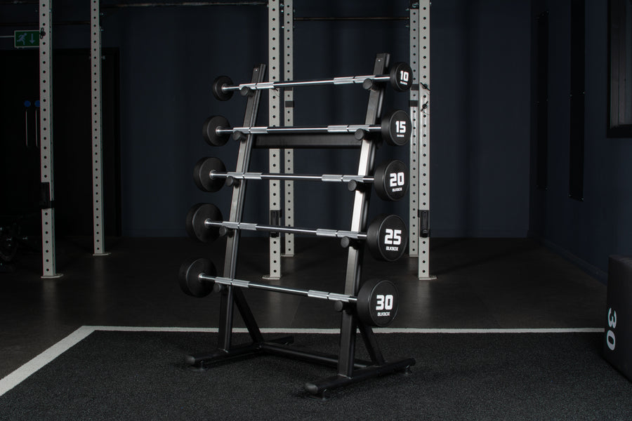 The BLK BOX Urethane Fixed Barbell is available in weights from 10kg to 45kg.