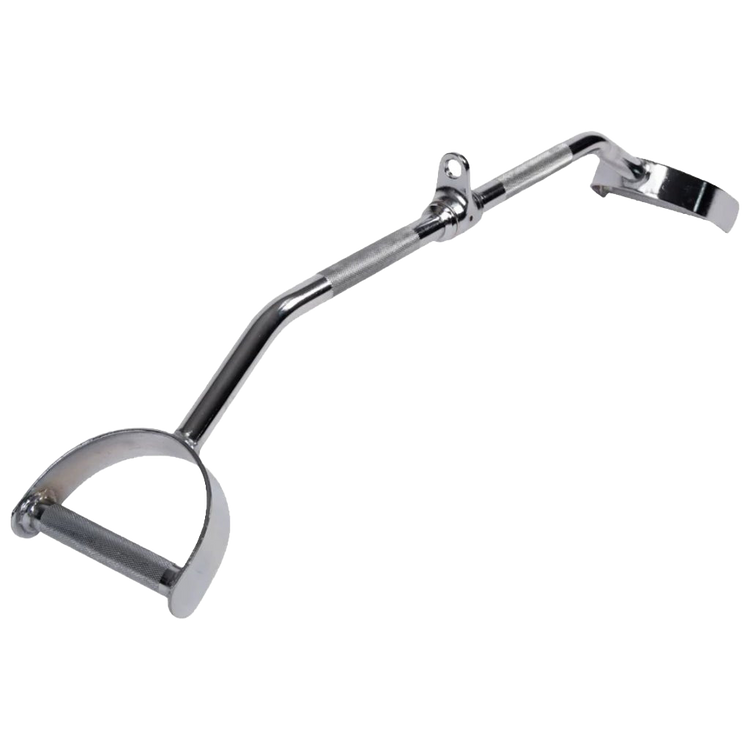 A durable steel attachment with a chrome finish, featuring a wide grip, knurling for secure hold, and a 360° rotating eyelet for smooth, natural back training.