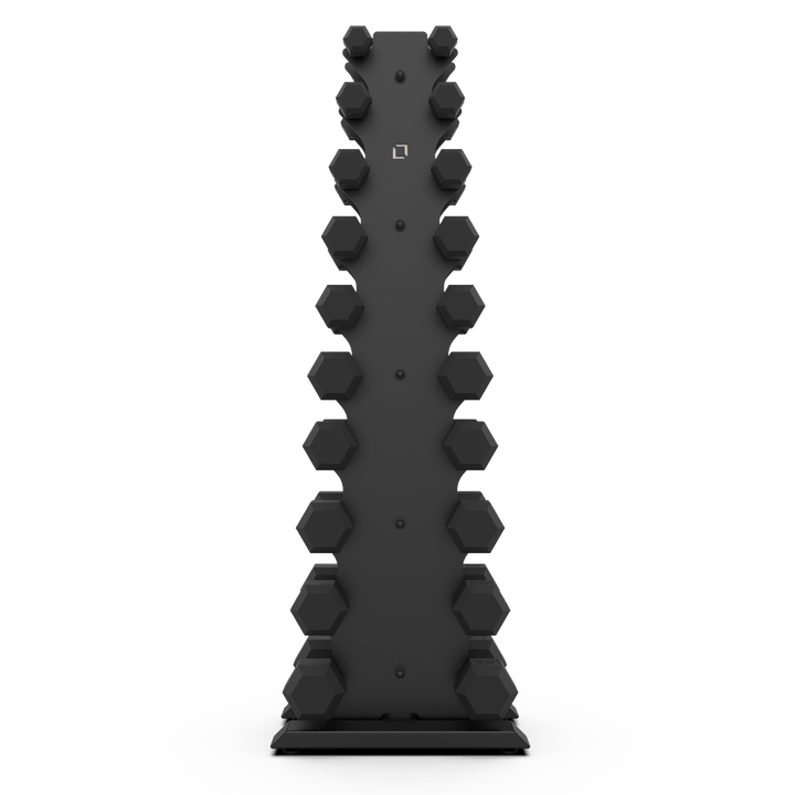 The BLK BOX Vertical Dumbbell Rack is a compact storage solution for both home gyms and commercial facilities. Designed to hold Hex or round dumbbells from 1–10kg, it keeps your training space organised and clutter-free. Grip cusps allow easy access, while adjustable rubber feet ensure stability and safety. Finished in a textured anti-scratch powder coat, the rack is built for long-lasting durability.