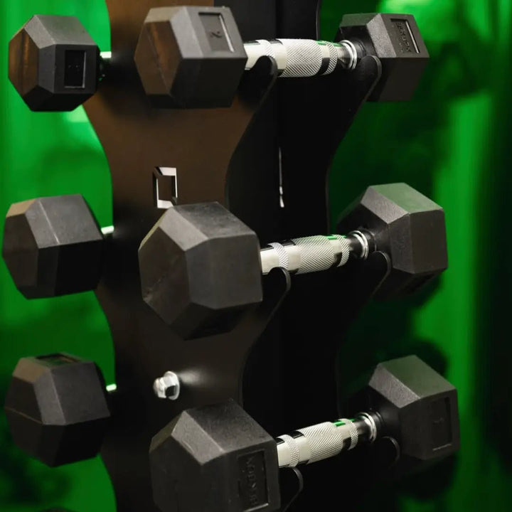 Rubber Hex Dumbbell Set (1–10kg): Heavy-duty, rubber-encased heads minimise noise and protect flooring. Chrome-plated, contoured handles provide a secure and comfortable grip.